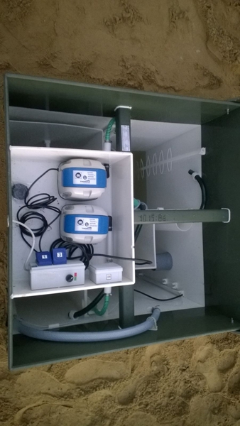 Опускание станции производится вручную либо с помощью стрелы манипулятора или крана. При обсыпке корпуса песком септик одновременно заполняется чистой водой (происходит выравнивание внешнего и внутреннего давления). Далее происходит подсоединение подводящих и отводящих коммуникаций. В последнюю очередь подключается электрический кабель, устанавливаются компрессоры и насос (если станция с принудительным выбросом).