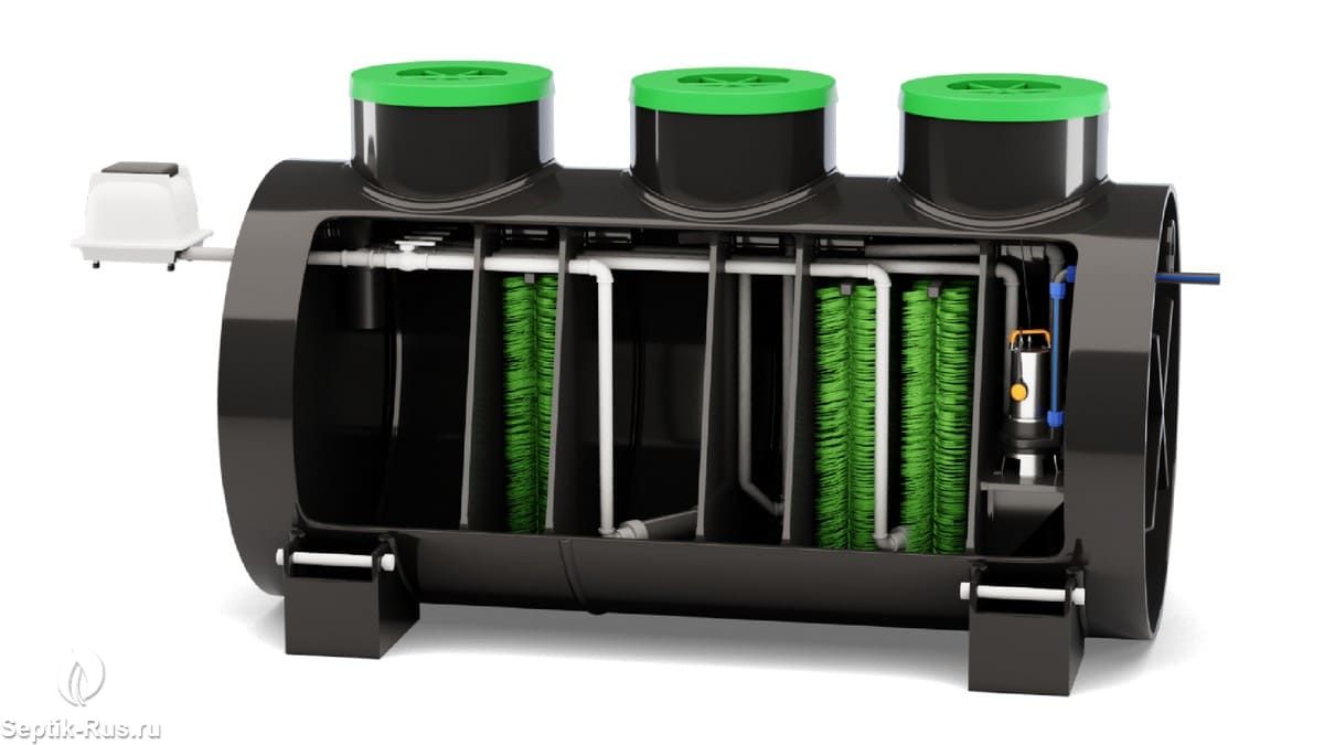 Дальнейшая очистка в септике Диамант 3 осуществляется в аэротенке с ершовой загрузкой, донная часть которого снабжена мелкопузырчатым аэратором. Благодаря доступу кислорода на загрузке развиваются аэробные микроорганизмы, которые необходимы для поглощения и окисления загрязнений.