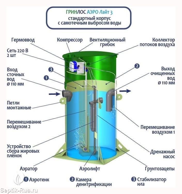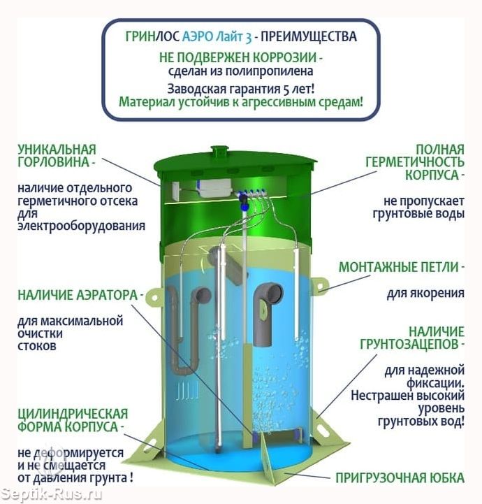 Станция Биологической Очистки Гринлос Аэро Лайт 3 предназначены для расщепления и переработки основных органических загрязнений, содержащихся в бытовых сточных водах. Эти процессы происходят в результате жизнедеятельности аэробных микроорганизмов, условия для жизнедеятельности которых создает септик.
