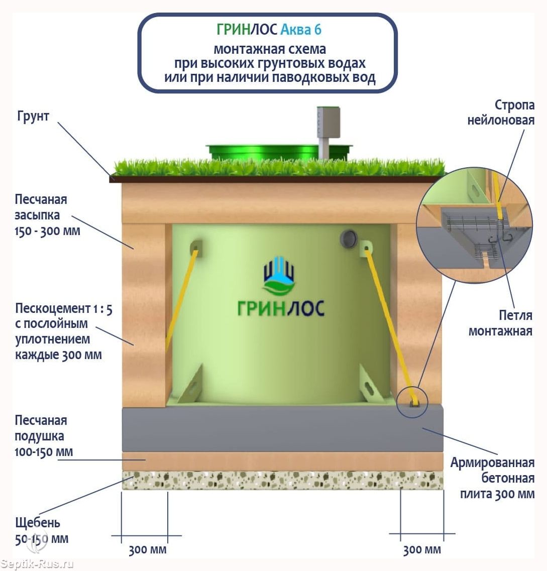 Перед непосредственным монтажом ГРИНЛОС Аква 6 специалисты осуществляют подготовку котлована. Его размеры определяются конструктивными особенностями выбранной модели оборудования.